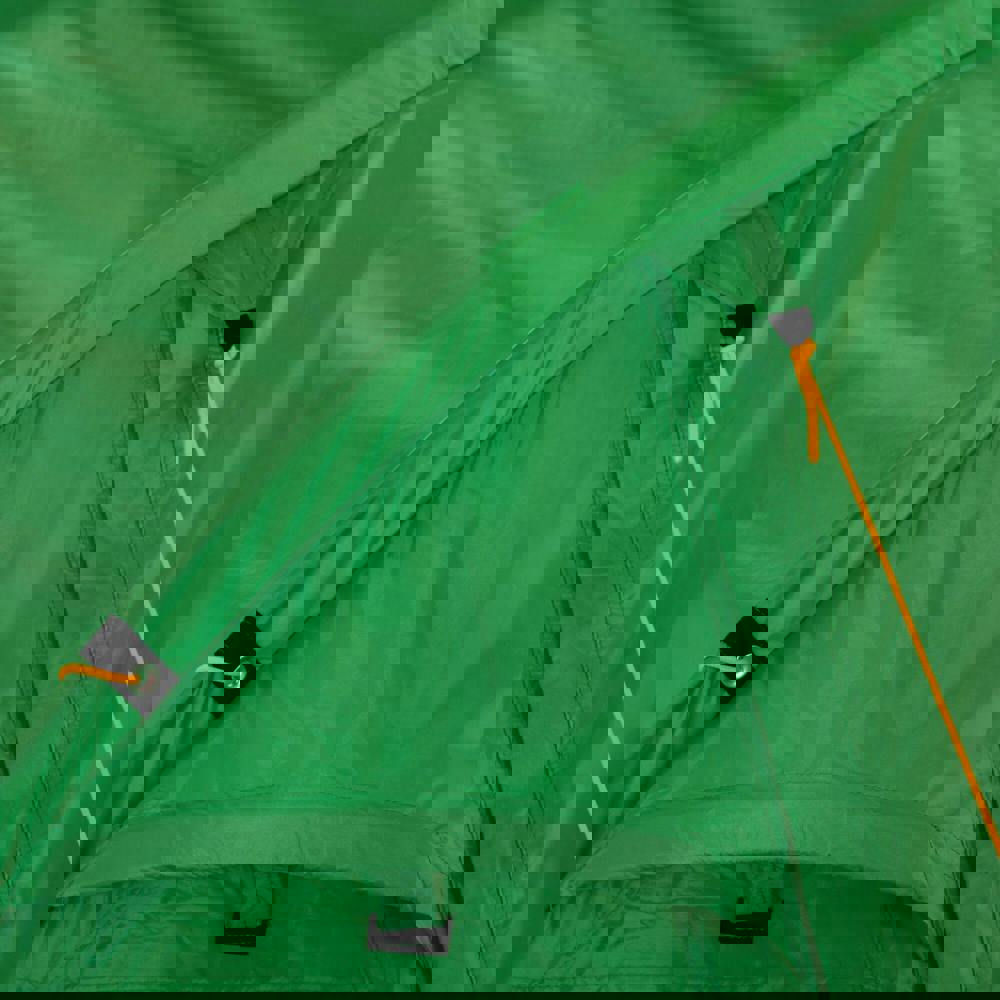 Finished in green with a plain design and logo detailing, this tent includes bright guy lines for visibility. It uses fibreglass poles and a clip-on fastening system for setup. The Hydrafort fabric is described as hardwearing, waterproof and fire retardant, and the tent features a waterproof PE groundsheet. A 3000mm hydrostatic head is stated for weather protection, and lantern hanging points add convenience for evenings at camp.
