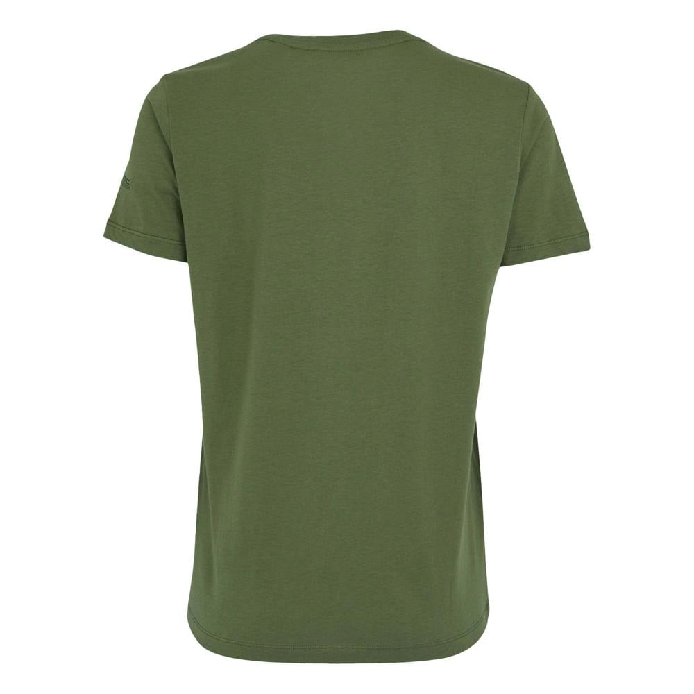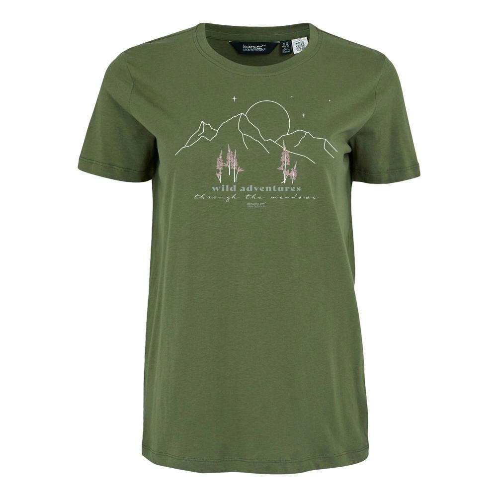 This Regatta Filandra IX T-shirt comes in Four Leaf Clover and is made from a cotton and polyester blend. It uses Coolweave jersey with stretch and a 160gsm weight. The design combines a graphic print with mountain, sun and text details.