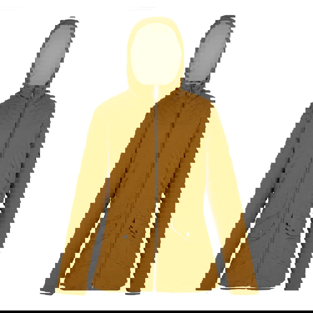 A hooded neckline and long sleeves provide coverage, while the full zip fastening keeps the front clean and practical. Storage includes internal pockets plus two lower pockets with flap closures. The hood is finished with sew-on faux fur. Fabric technology includes breathable performance, a durable water repellent finish and wind resistance.