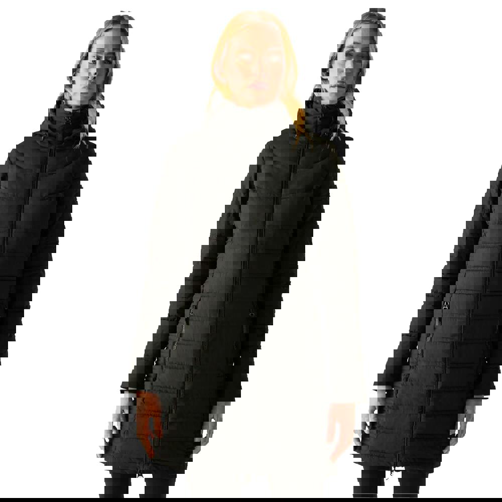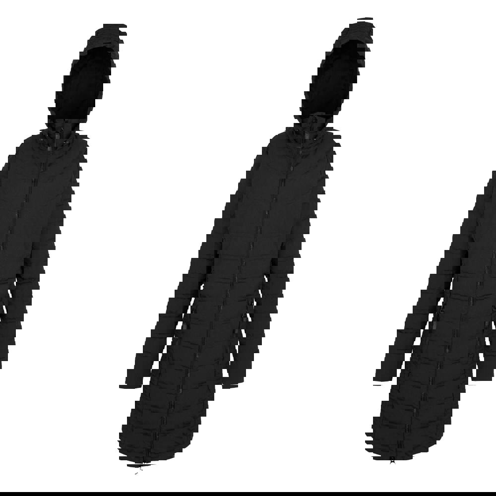 The Regatta Andria padded jacket is a longline, quilted style in plain black. Made from 100% polyester with a taffeta lining, it uses feather-free synthetic down filling at 200gsm. The fabric has a durable water repellent finish and a lightweight, water repellent construction.
