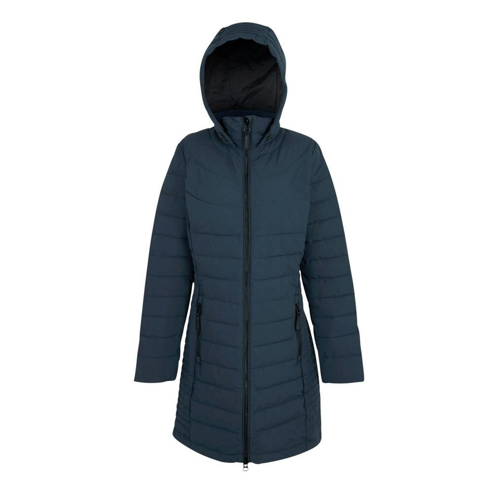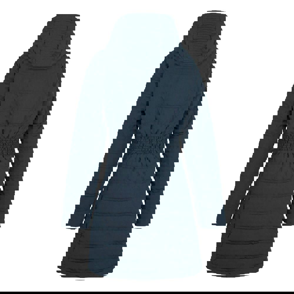 The Andria padded jacket from Regatta is a longline, quilted style in navy with a plain finish. Made from 100% polyester, it uses a feather-free synthetic down filling and a taffeta lining. The lightweight fabric is finished with a durable water repellent treatment for a water repellent outer.