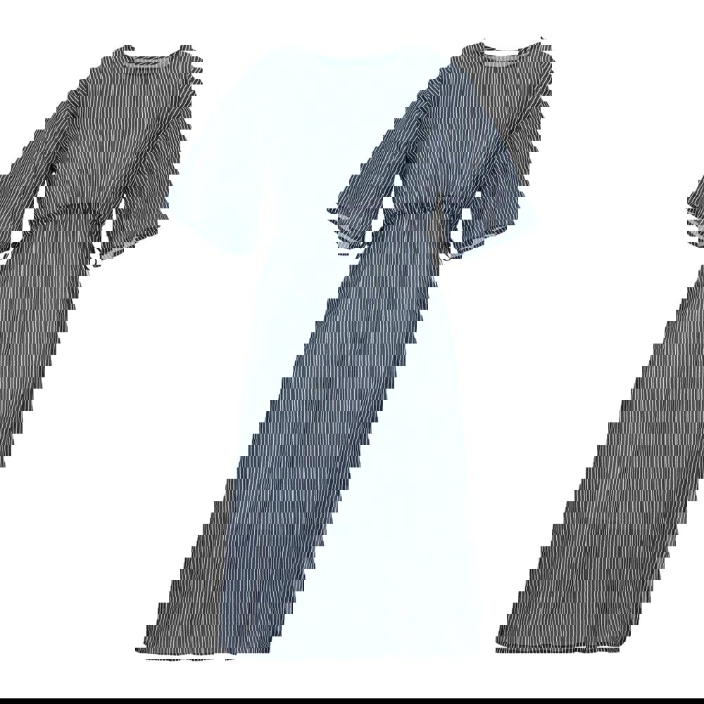 This kaftan is made from 100% polyester with a lightweight 50gsm construction. It comes in a navy and white wavy stripe design, finished with a crew neckline and short sleeves for a clean, simple look.