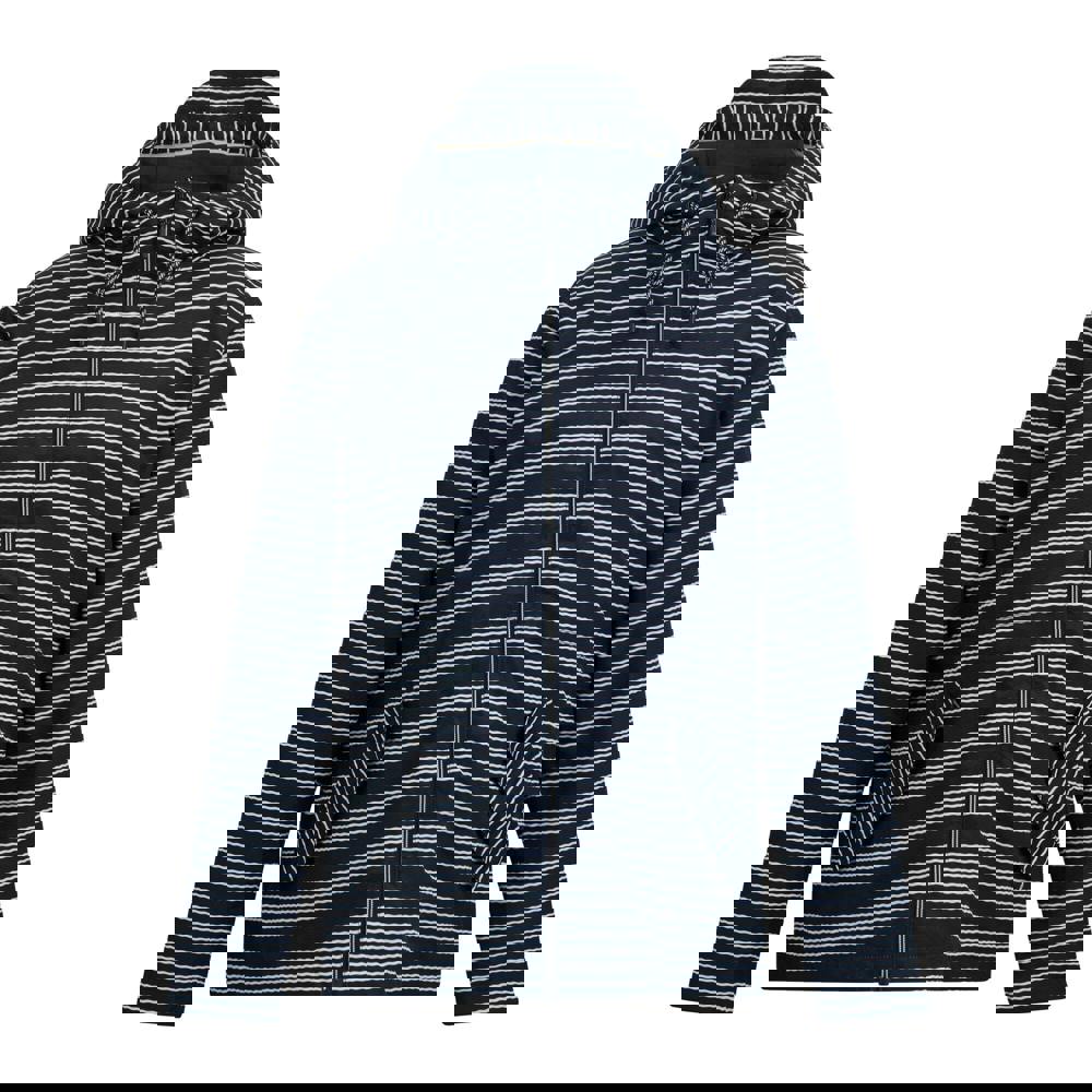 The Bayletta contrast striped waterproof jacket from Regatta comes in navy and white with a hooded neckline and long sleeves. It fastens with a full zip and includes two lower pockets for everyday essentials. An inner drawcord at the waistline and adjustable stud cuffs allow the fit to be adjusted.