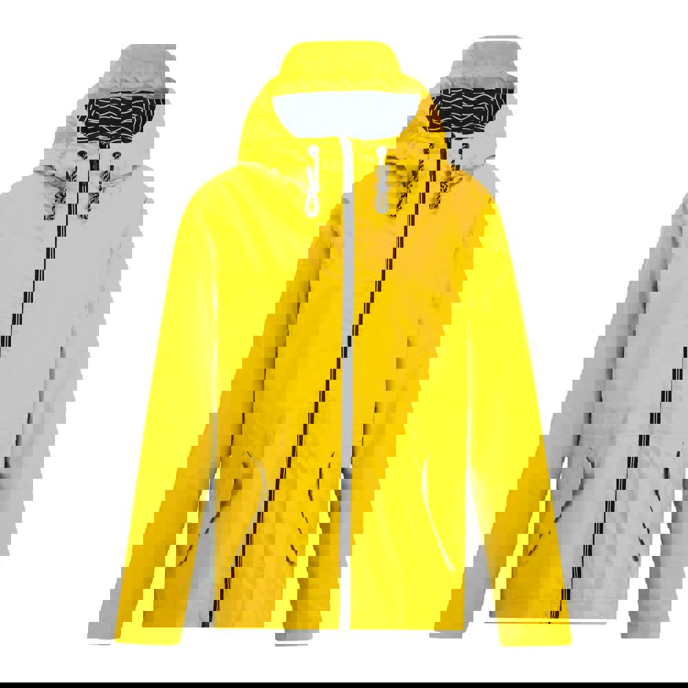 This waterproof jacket is made from 62% polyester and 38% recycled polyester, with a jersey, soft taffeta lining at 60gsm. It has a hooded neckline with a grown-on hood and drawstring adjustment, plus long sleeves finished with hook and loop strap cuffs. A full zip fastening keeps the front clean and practical, while a drawcord hem allows adjustment.