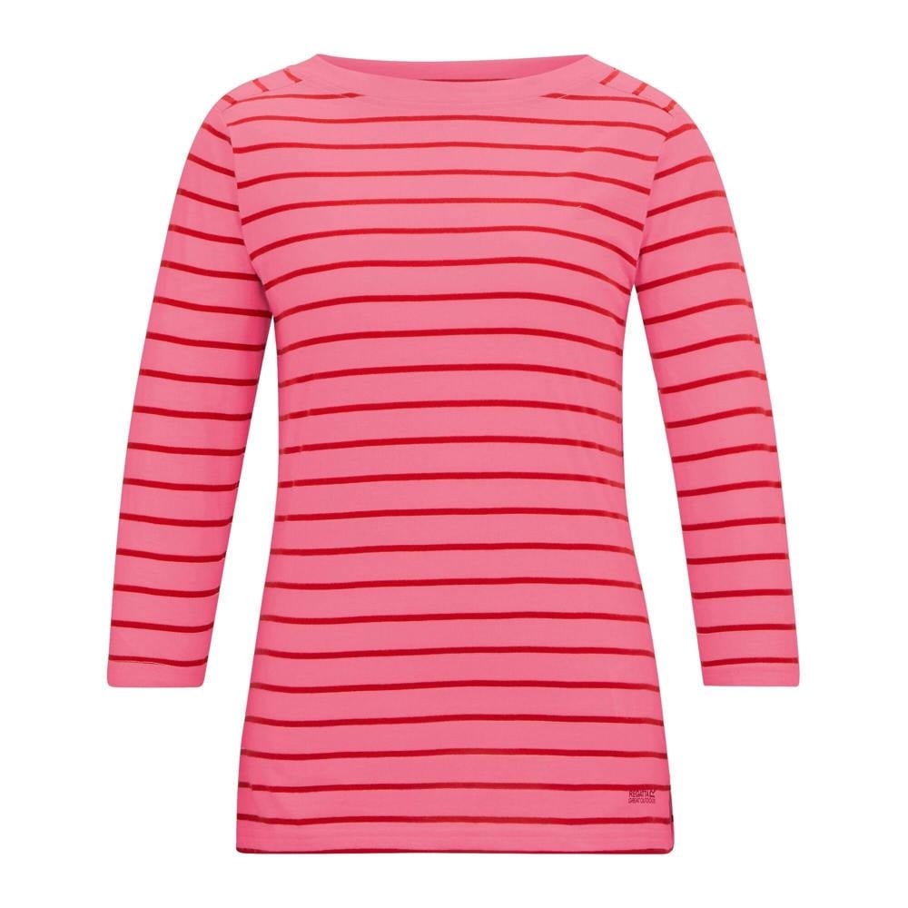 Regatta’s Baylette II striped T-shirt brings a clean, casual look with practical detailing. Made in Coolweave with a 155gsm weight, it combines 50% cotton and 50% polyester for an easy everyday layer. The wide boat neckline and 3/4 sleeves create a relaxed silhouette, while the shaped hem with side vents adds subtle movement. Finished with a logo detail and a UPF 30+ sun rating, it suits warm-weather wear and layering alike.