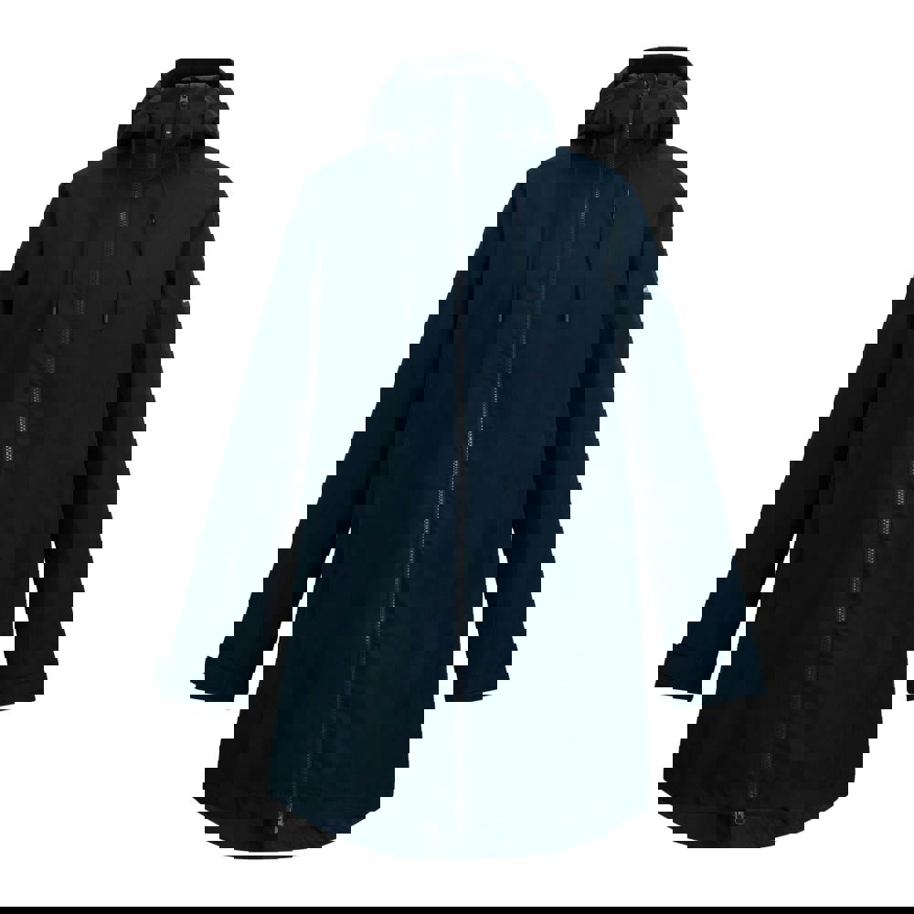 Regatta Brianka waterproof jacket in navy blue with a plain design. Made from 62% polyester and 38% recycled polyester, with a taffeta lining in 100% recycled polyester (60gsm). The lightweight construction includes taped seams and a central back pleat.