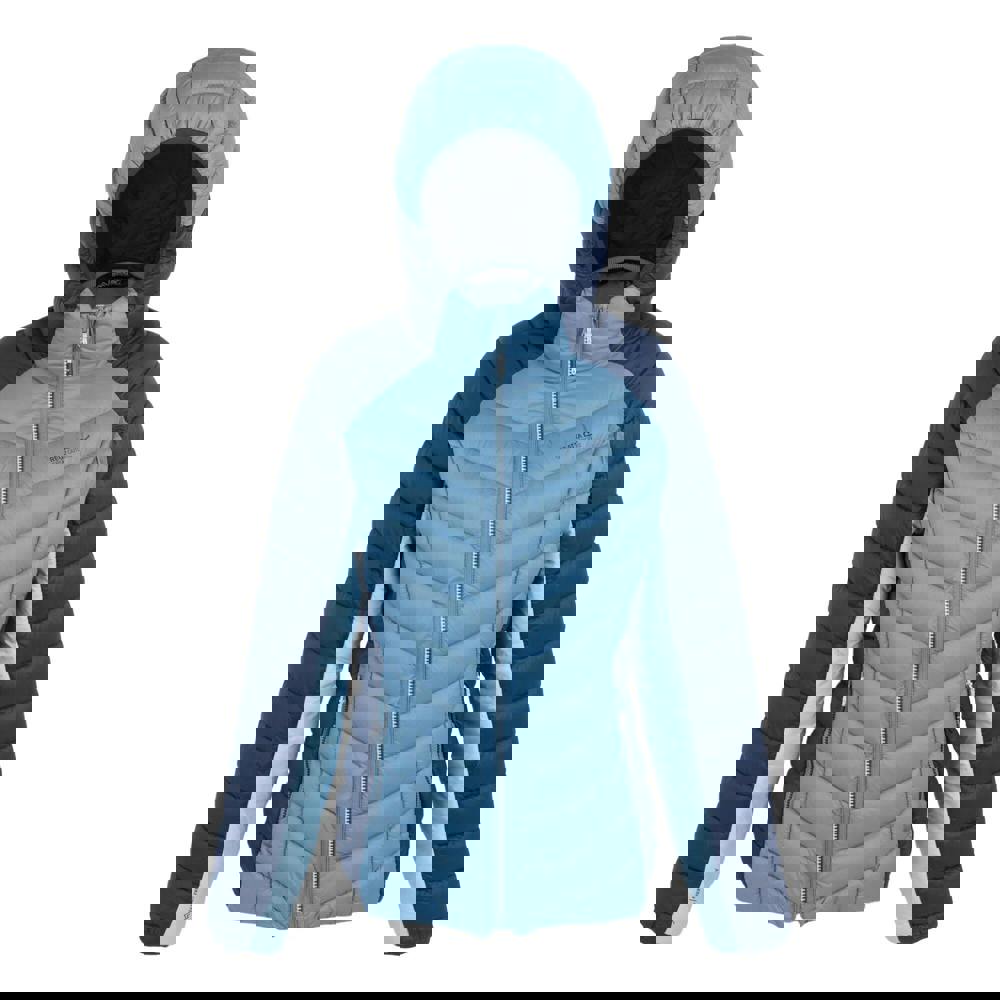 The jacket has long sleeves with stretch binding at the cuffs and hem, plus a grown-on hood with stretch binding. A full zip fastening and two lower zipped pockets complete the practical layout.