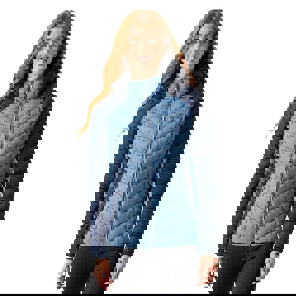 This quilted hooded jacket is made from polyamide with a feather-free synthetic down filling and a midweight fabric. It has a colour block design with a logo and quilted finish, and uses 20D fabric.