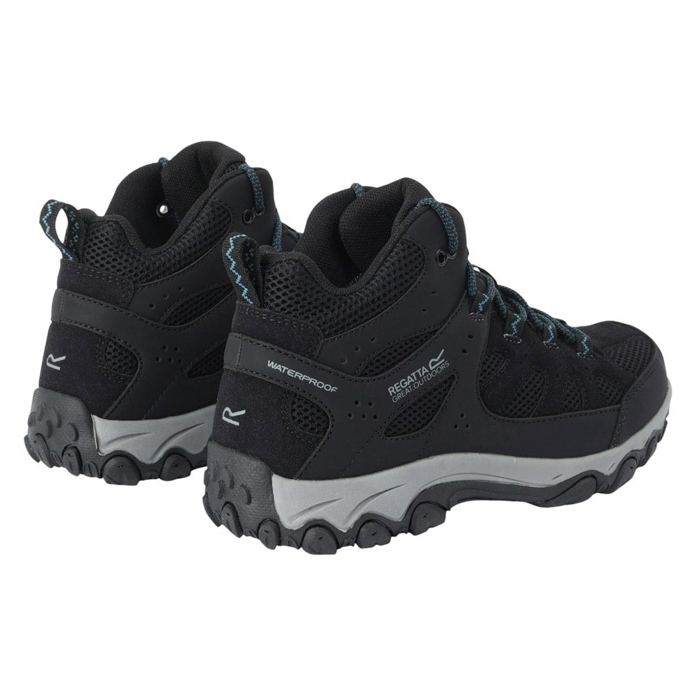 These Regatta Edgepoint IV walking boots come in black with a mid cut and a low heel. The upper uses durable polyester and PU (polyurethane) with a water resistant finish. A round toe and lace-up fastening keep the look classic, while contrast detail and logo branding add a defined finish.