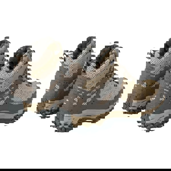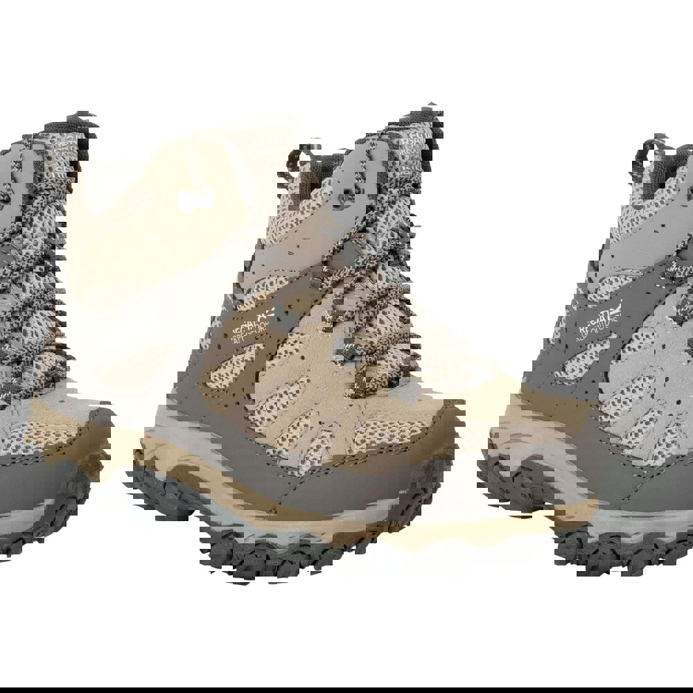 These Regatta Edgepoint IV walking boots come in taupe with a mid cut and a round toe. The upper uses durable polyester and PU (polyurethane) with a water resistant finish, finished with contrast detail and a logo. A lace-up fastening with five eyelets keeps the look classic and secure, while a pull tab supports easy on and off.
