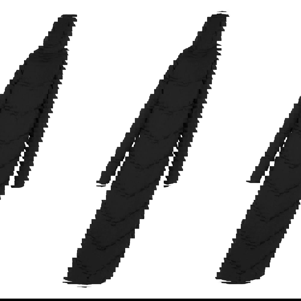 The Regatta Eloria padded jacket in black is a longline, hooded style with a quilted plain finish and logo detail. Made from 100% polyester with stretch, it has a taffeta lining and padded filling. The outer is 80gsm and the filling is 280gsm.
