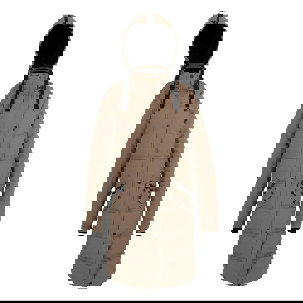 Regatta Womens Eryn Padded Jacket in mocha/black is made with a 100% polyester outer and a 100% polyamide lining. The quilted, padded construction uses feather-free synthetic down filling (230gsm), with an outer weight of 112gsm and a lining weight of 37gsm. A durable water repellent finish and lightweight fabric technology complete the shell.