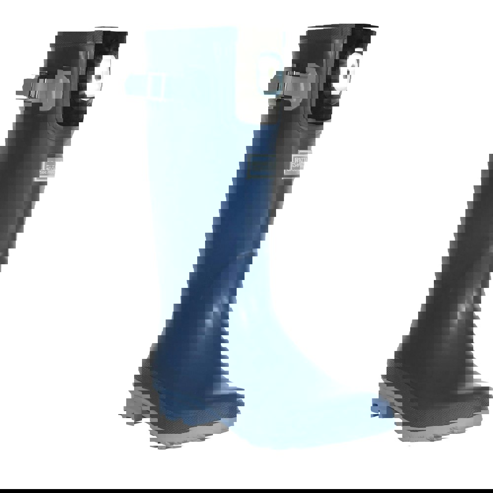These Regatta Fairweather Shine LED wellington boots come in slate blue with a mid-calf cut and a round toe. The upper is made from vulcanised rubber with a waterproof finish, paired with a cotton lining. A block heel and pull-on fastening keep the profile simple, while an adjustable strap adds a practical detail.