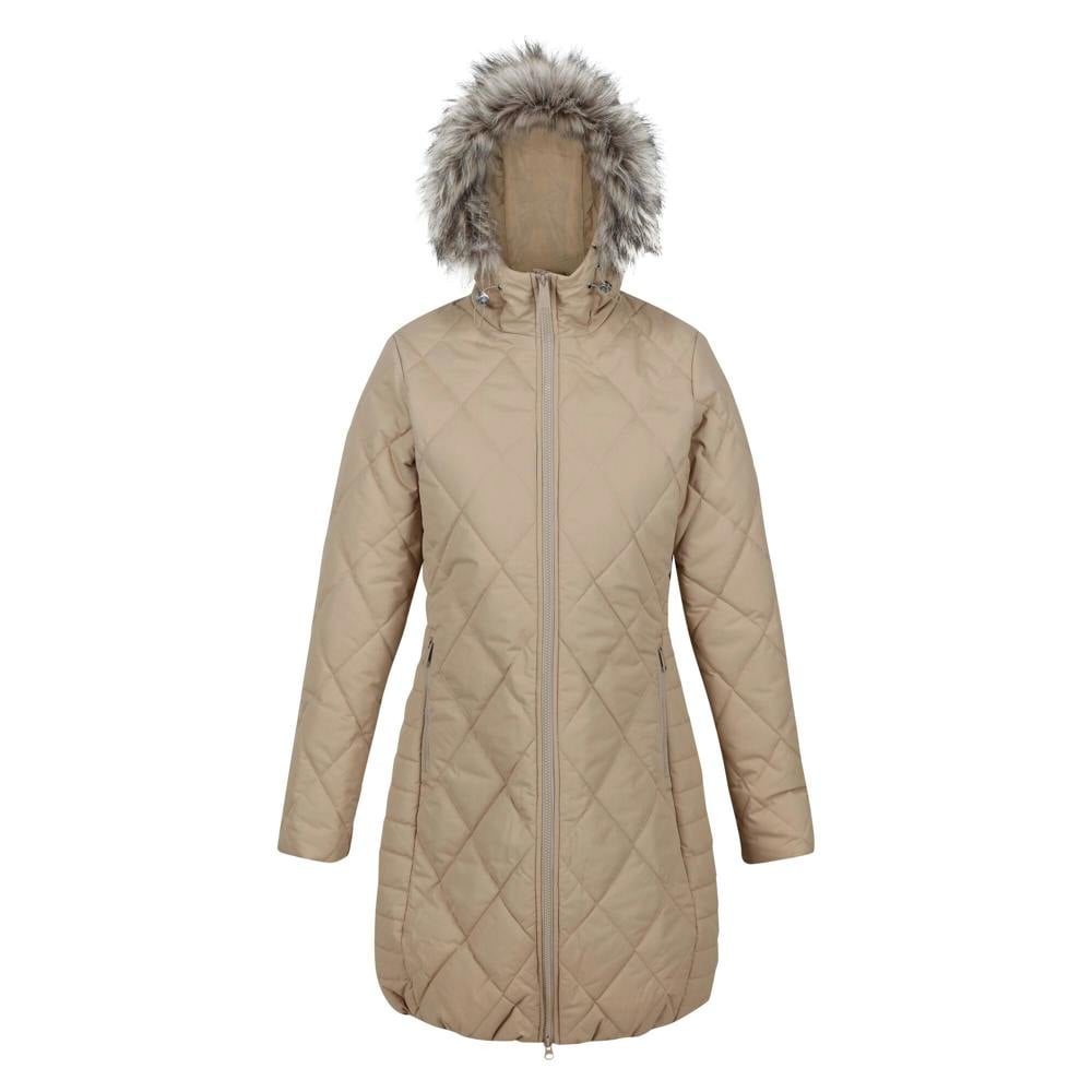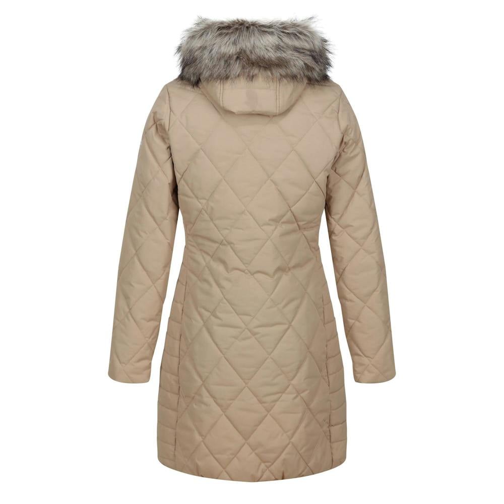 This insulated parka is made from 100% polyester in baffled micro poplin, with a taffeta lining. It has a mid length cut and a hooded neckline, finished with a grown on hood, drawstring adjustment and faux fur trim. Long sleeves and a two way zip fastening complete the outer.