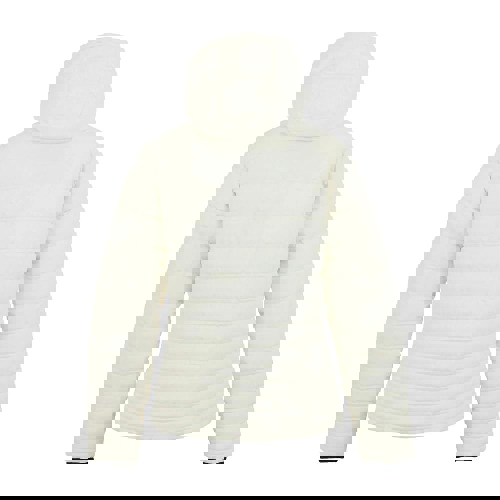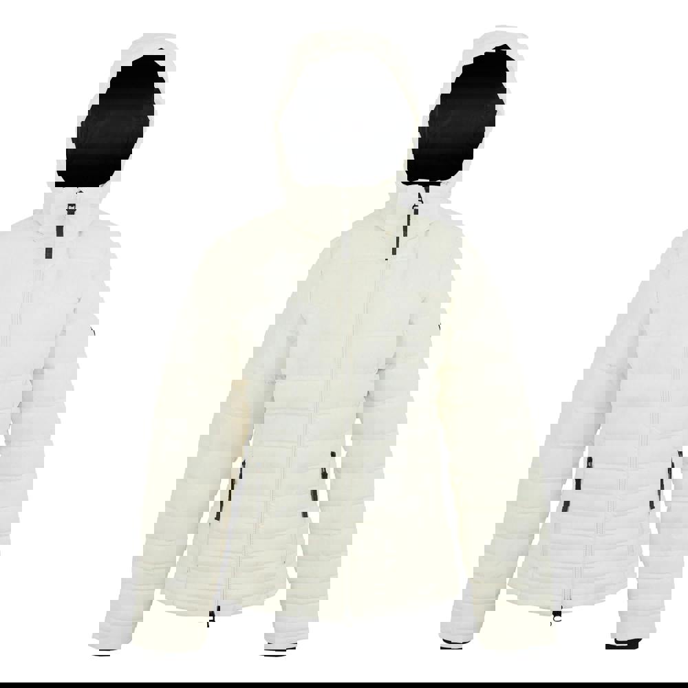 The hooded neckline combines a ribbed finish with a grown-on hood and sew-on construction. Long sleeves are completed with ribbed cuffs. Storage includes two side pockets and two security pockets, all secured with zip closures. The front fastens with a full two-way zip.