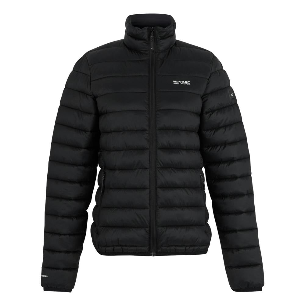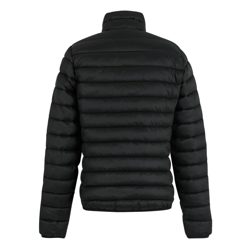 This quilted jacket is made from recycled polyamide and finished in black with a logo detail. It is lined and filled with midweight synthetic down, offering a lightweight feel with a durable, water repellent finish. A funnel neck and long sleeves create a clean, practical silhouette for everyday wear.