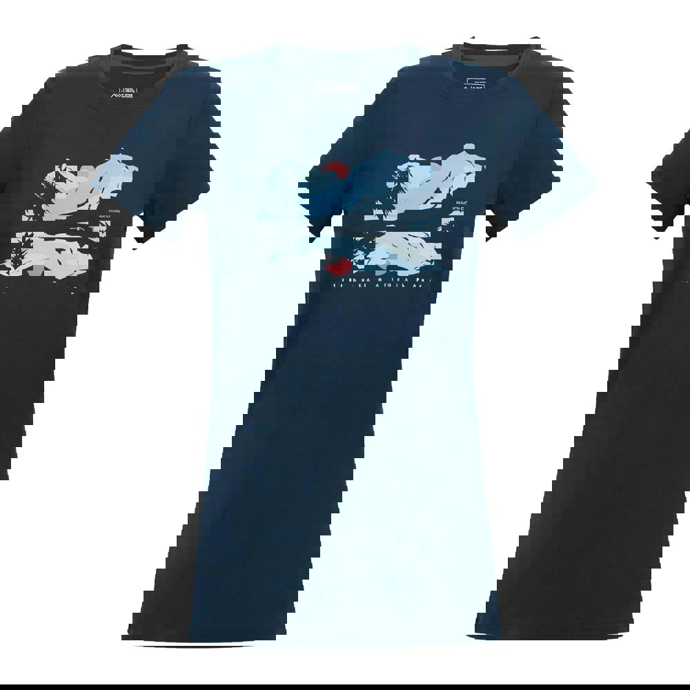 This Regatta women’s T-shirt comes in navy blue with a mountain design and a classic crew neck. Cut with short sleeves, it suits everyday wear and easy layering.