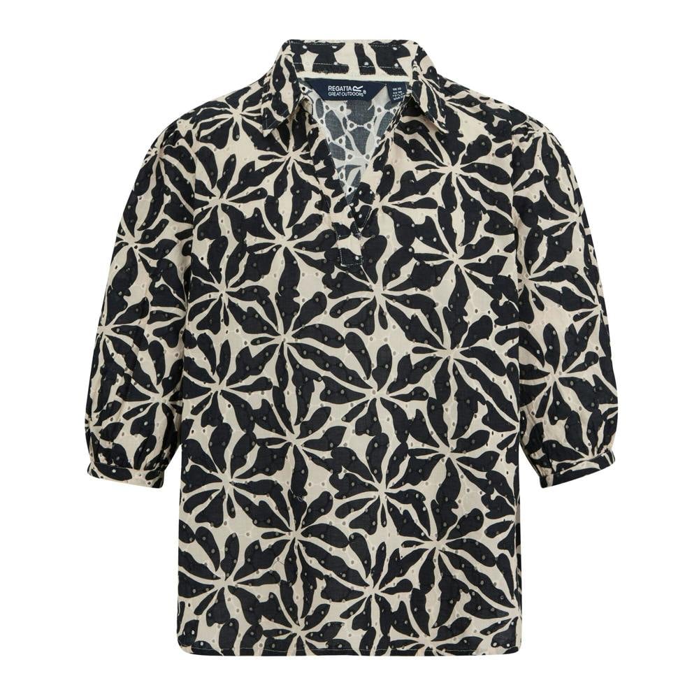 This beige shirt is made from 100% cotton with a 120gsm handle. It has an abstract floral broderie design and a relaxed fit, offering an easy shape for everyday wear. The neckline is open with a turn down collar, finished with a buttonless placket for a clean front.