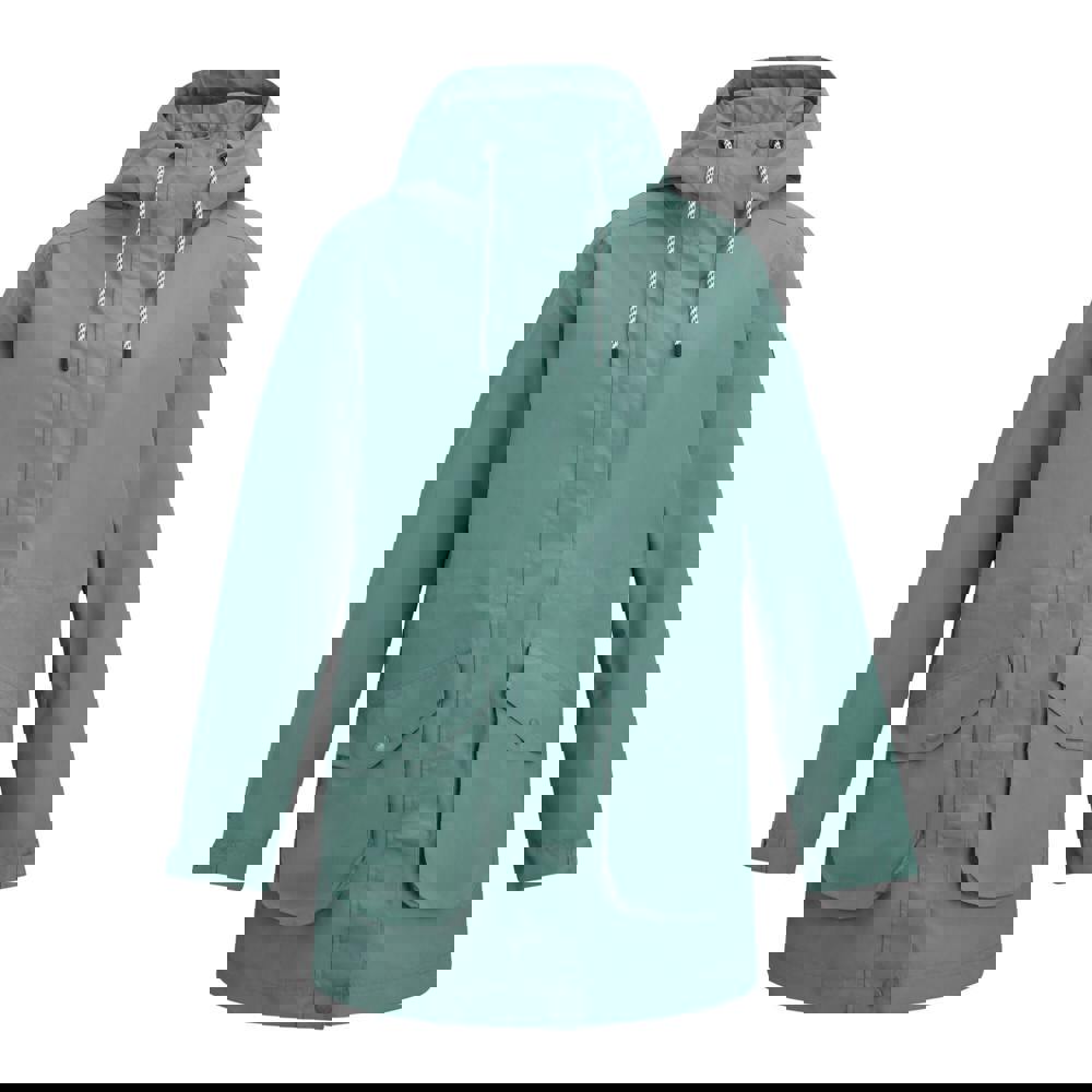 The hooded neckline includes a grown-on, sewn-on hood with a drawstring for adjustment. Long sleeves are finished with adjustable cuffs and snap fastenings, while the hem adjusts with a shockcord. Storage is organised with two side pockets and a security pocket, each with flap and snap fastening closures.