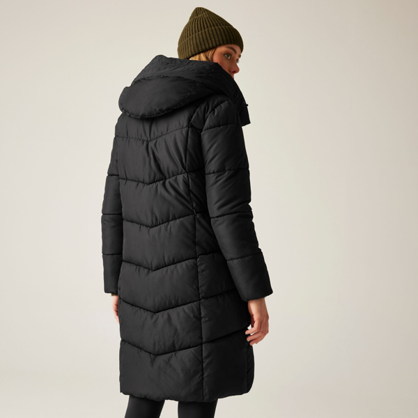 This long, hooded quilted jacket is made from 100% polyester and finished with a DWR coating. It is insulated with feather-free, midweight synthetic down that includes recycled content, and lined in taffeta for a smooth internal finish.