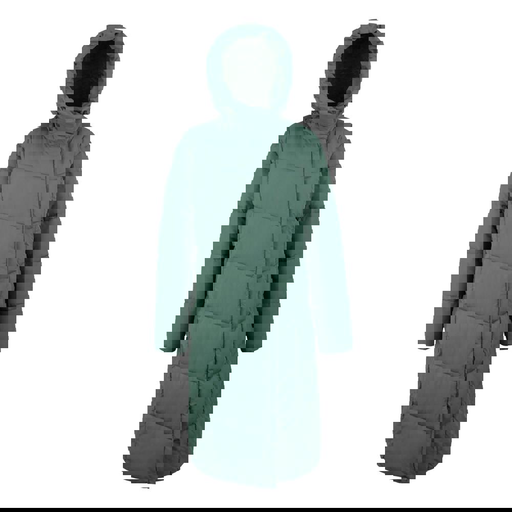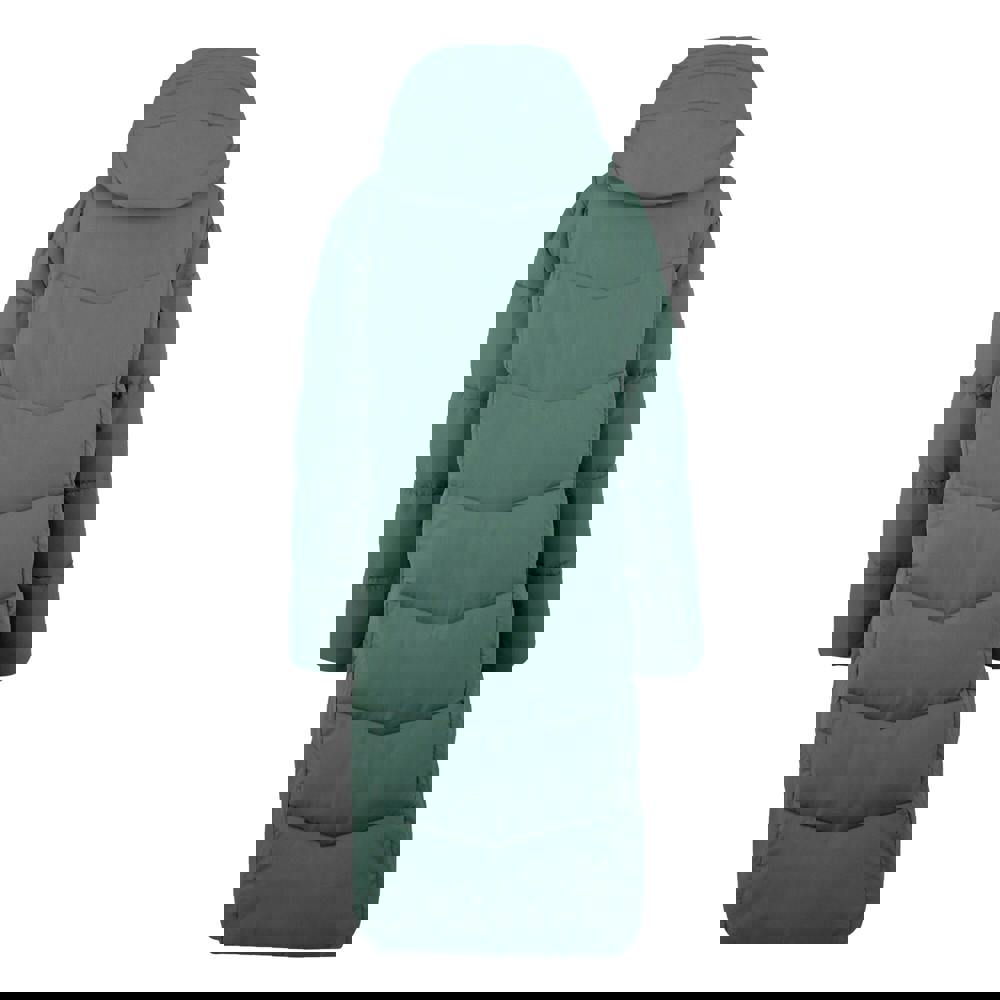 This long, hooded quilted jacket is made from 100% polyester with a taffeta lining. It uses feather-free, midweight insulated filling made from recycled synthetic down and is finished with DWR fabric technology. The design includes a logo and a branded badge, keeping the look clean and practical for everyday outerwear.