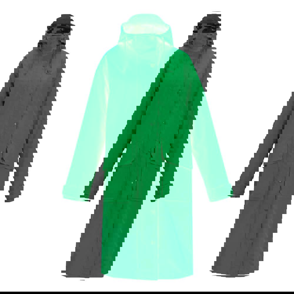 This long length waterproof jacket is made from stretch fabric with a taffeta lining. The outer uses 62% polyester and 38% recycled polyester, with a 100% polyester lining. It has a plain finish with an inner print and a hooded neckline for added coverage.