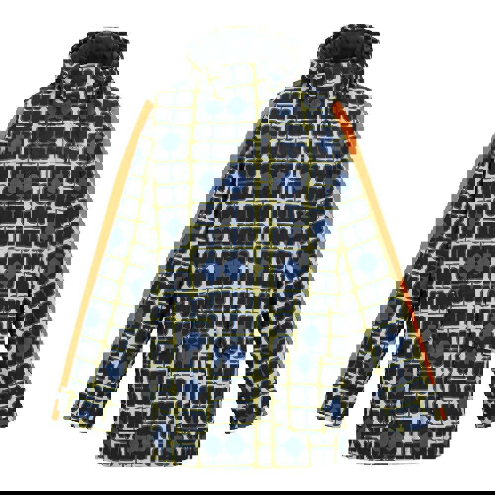 This mid length waterproof jacket is made from a stretch fabric with a patterned design. It uses a blend of 62% polyester and 38% recycled polyester, with a 110gsm fabric weight. The jacket is hooded with a sewn-on hood and long sleeves, and it fastens with a full zip and snap closure.