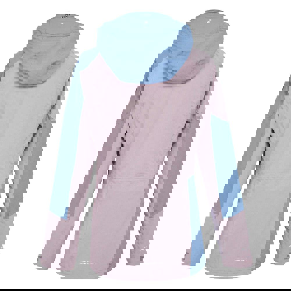 The hooded neckline includes a standing collar and a grown-on technical hood with a wired peak and concealed toggle adjuster. Practical details include an inner zip guard, underarm zips for ventilation, and touch fastening tabs at the cuffs. Two zipped side pockets keep essentials secure, and a water repellent zip completes the front fastening.
