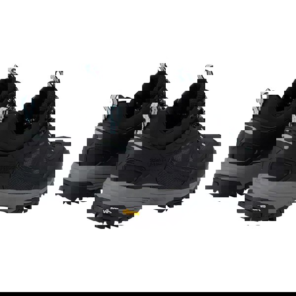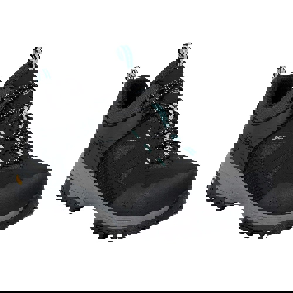 Regatta Regen low walking shoes in black/aqua with a low cut profile and round toe. The upper combines durable mesh and synthetic materials with a water resistant finish, paired with a breathable lining for everyday wear. A cushioned, die cut insole includes an Isotex membrane and TECFOAM, while the impact absorbing XLT midsole supports underfoot comfort.