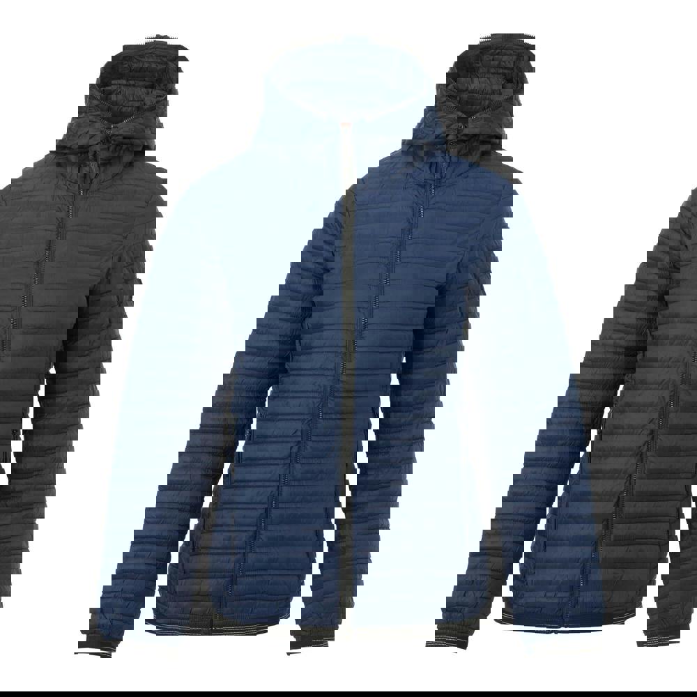 Regatta Womens Rigain Quilted Jacket in navy is a lightweight, plain-design layer with a quilted finish and a hooded neckline. Made from recycled materials, it uses 100% polyamide with a durable water repellent finish.