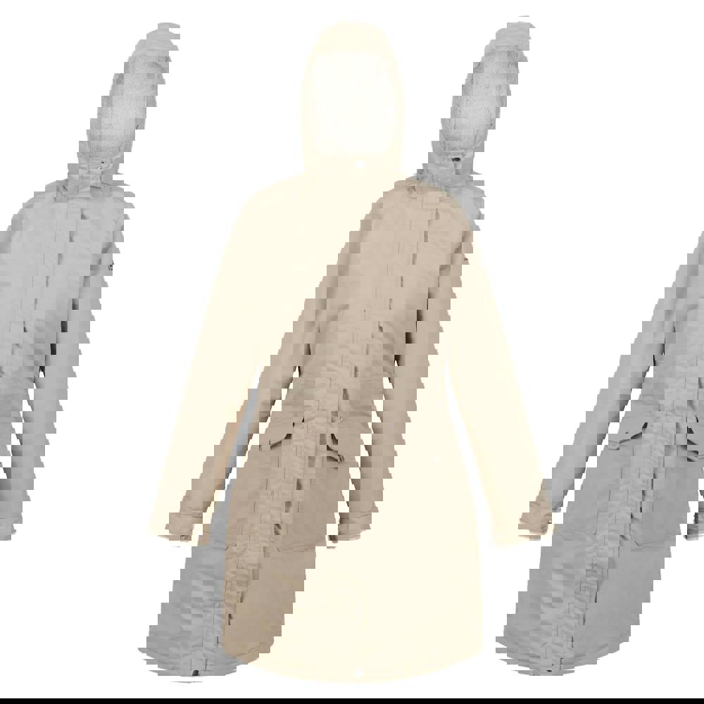 This women’s Romine parka from Regatta is made from 100% polyester taslan with a taffeta lining. It has a plain finish with a badge detail and a hooded neckline with a grown-on hood and faux fur trim. Long sleeves are finished with turned up cuffs.