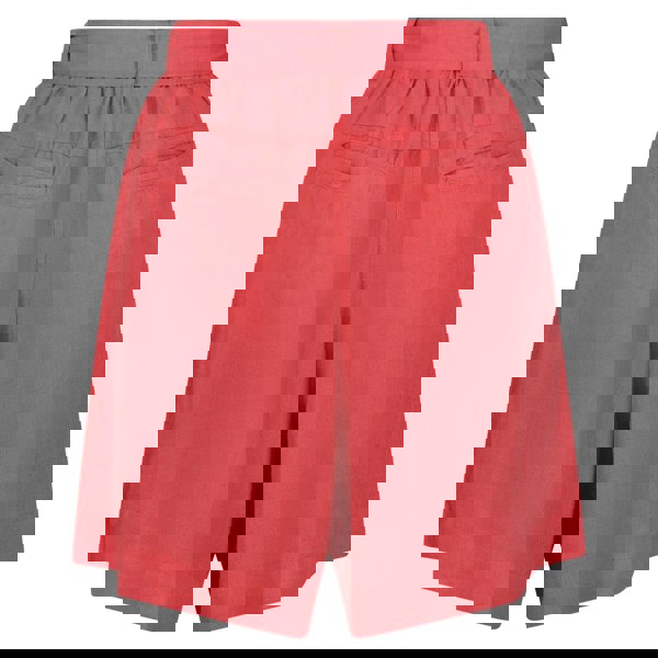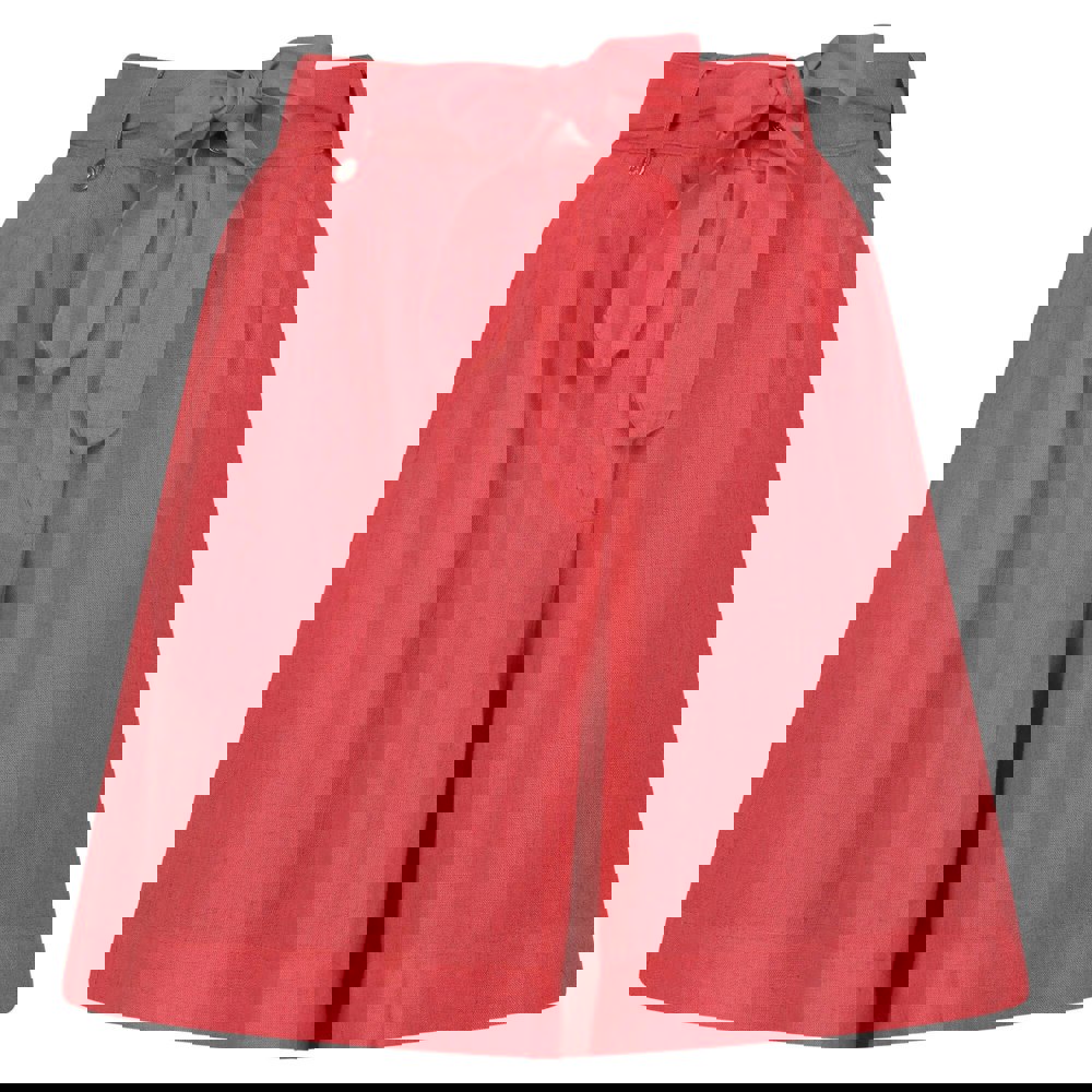 A paper bag waistline and tie belt create a defined shape, while two back pockets add practical storage. The material is described as breathable and soft.