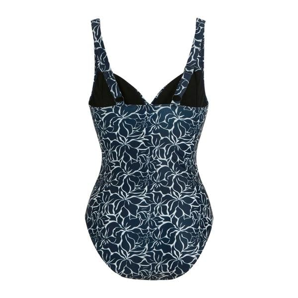 Regatta Sakari is a women’s one-piece swimsuit with a navy floral all-over print and built-in tummy control. It is made from 85% recycled polyester and 15% elastane in a 200gsm fabric weight, with a deep V neckline and a pull-on construction for a clean finish. Non-wired support is paired with padded cups and an adjustable strap for a secure, personalised fit. A UPF 50+ sun rating is also specified for added coverage in bright conditions.