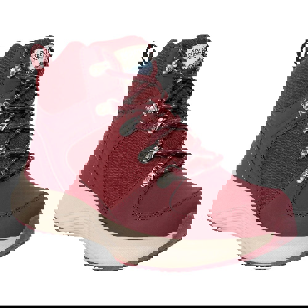 Regatta Sambrook walking boots in dusty rose with an ankle cut and plain design. The upper combines canvas, nylon, polyester and PU (polyurethane), finished with a round toe and a platform heel. Lace-up fastening and five eyelets provide a secure fit, while a pull tab supports easy on and off.