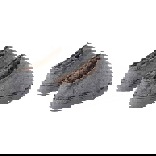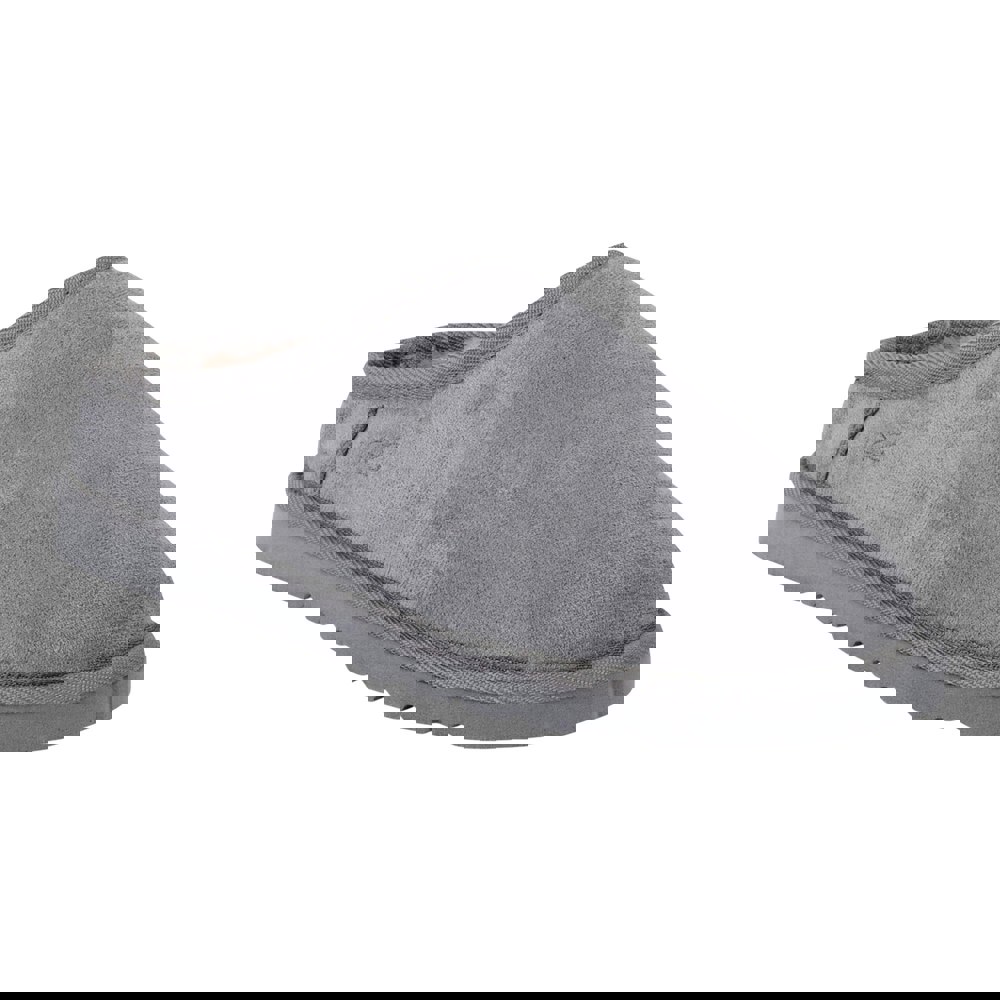 Regatta Solace mule slippers in dark steel offer a plain, slip-on design with a round toe and flat heel. The upper is made from soft synthetic suede, paired with a faux fur synthetic lining. A synthetic outsole completes the construction, with cushioned detailing included.
