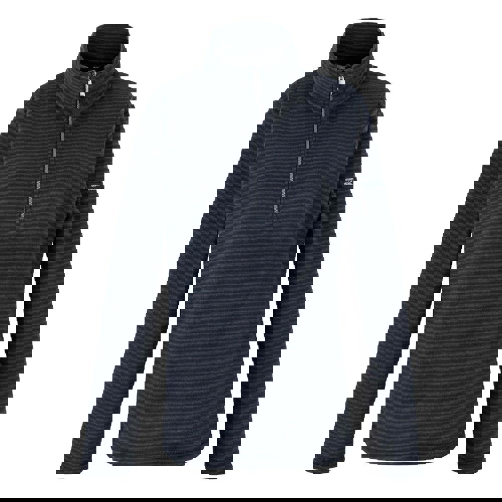 The Regatta Solenne II fleece jacket comes in navy and silver with a striped design. Made from 88% recycled polyester and 12% cotton, it has a 220gsm weight and a lightweight feel. The long-sleeved silhouette is finished with a standing collar and a half-zip fastening, allowing it to be pulled on with ease.