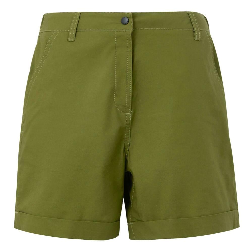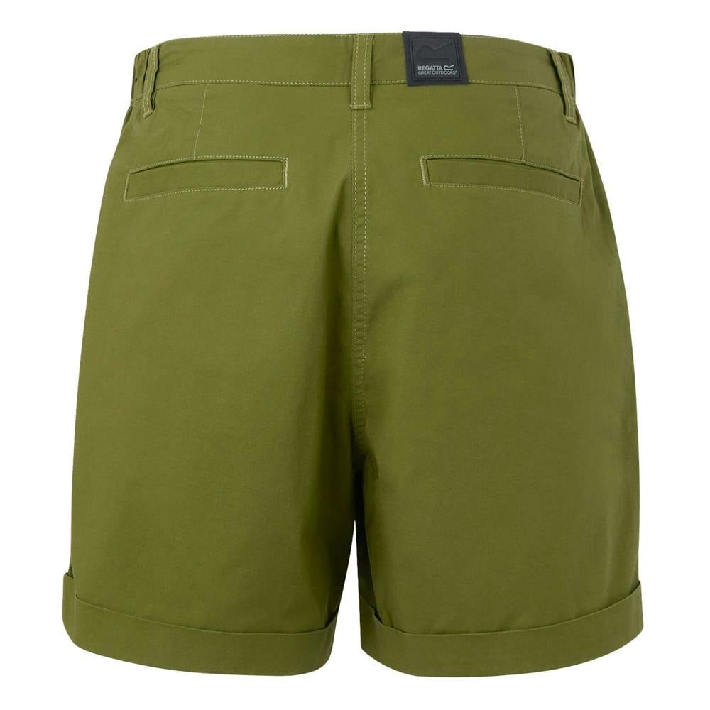 Regatta Womens Xanthi Shorts in Nephrite Green are made from poplin with 97% cotton and 3% elastane and a 145gsm weight. The design is plain with logo detailing and a printed waistline. A button fastening and zip fly provide a secure finish, while belt loops allow for styling with a belt.