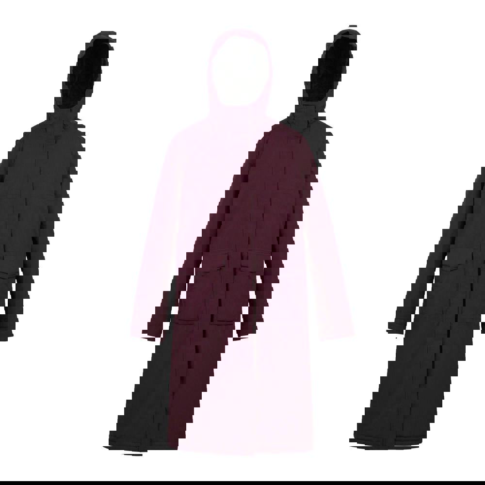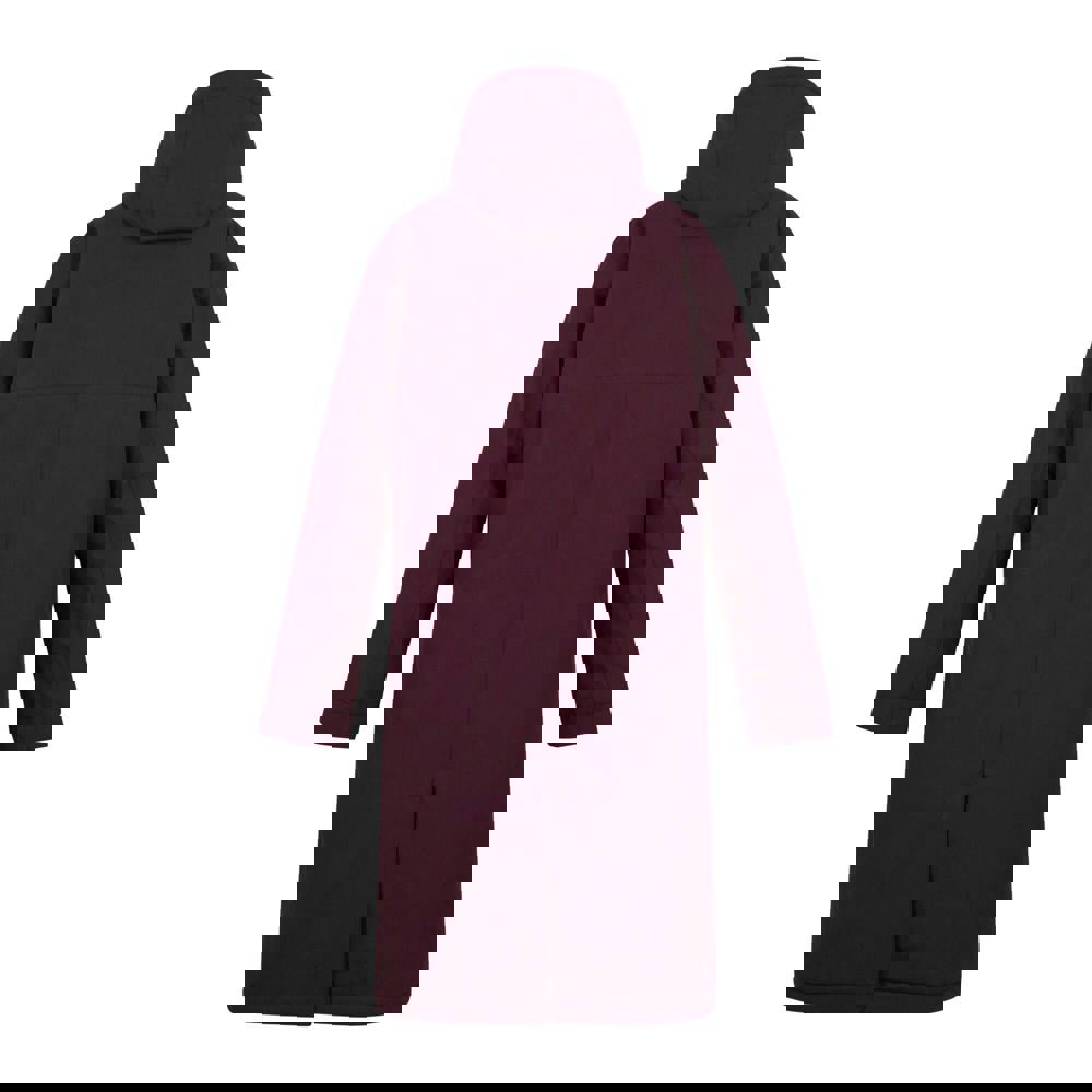 This longline waterproof jacket is made from 100% polyester with a fleece and taffeta lining and a midweight feel. It has a plain finish with a logo detail, plus a hooded neckline with a sew-on hood for added coverage.