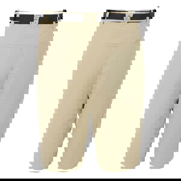The waistband is part elasticated and includes belt loops. Storage is arranged with two side pockets and a thigh pocket with a zip. The shorts fasten with a button and zip fly.