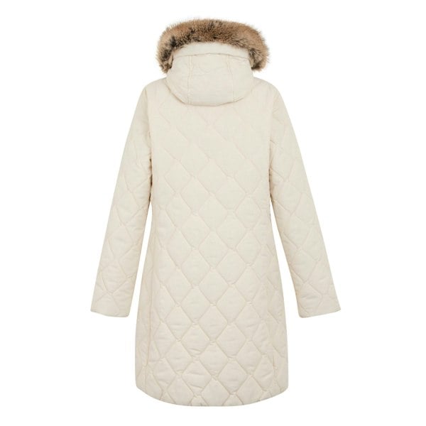 A hooded neckline and long sleeves provide coverage for everyday wear. The grown-on hood adjusts for fit and is finished with a faux fur trim. Storage includes two lower zip pockets and an internal security pocket, while a two-way zip fastening allows flexible wear.