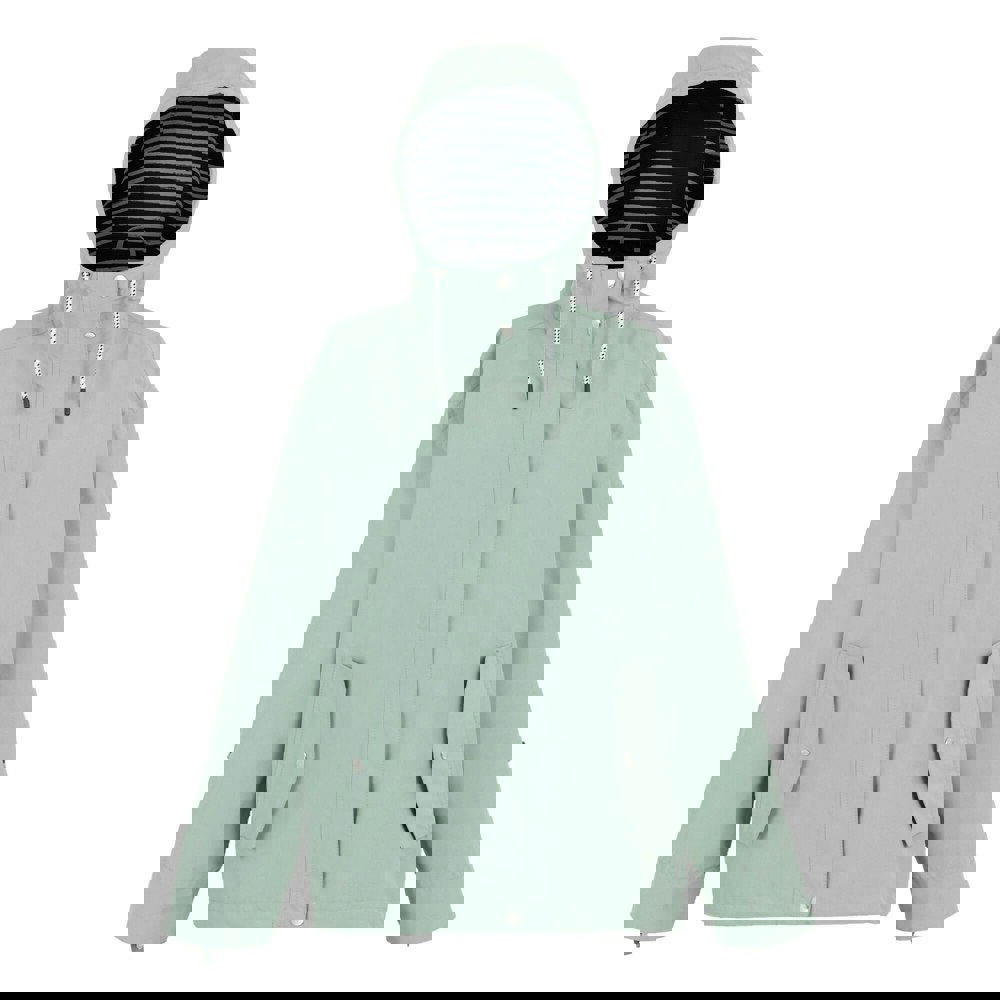 This women’s Sasry waterproof jacket from Regatta is made from 100% polyester with a peached finish and a striped taffeta lining. The design combines a plain look with logo detailing, and the snug fit is finished with an elasticated hem. A grown-on hood with drawstring adjustment and long sleeves with turned-up cuffs help complete the outerwear silhouette.