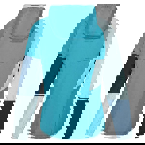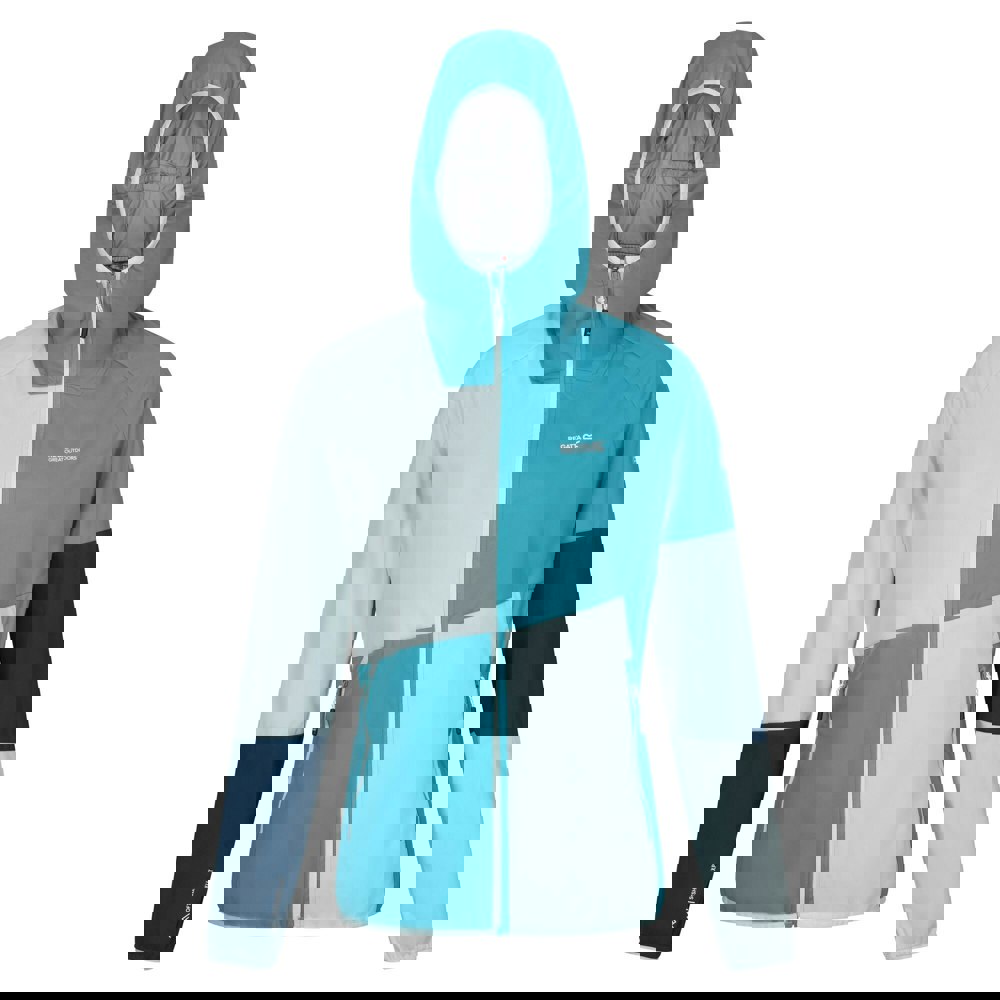 Regatta Tarvos VI waterproof jacket in Tahoe Blue/Bleached Aqua, made from 100% polyester softshell with added stretch. The design includes contrast trim and a logo, finished with a contrast zip fastening and an inner zip guard. Long articulated sleeves sit alongside a hooded neckline with a standing collar for a structured look.