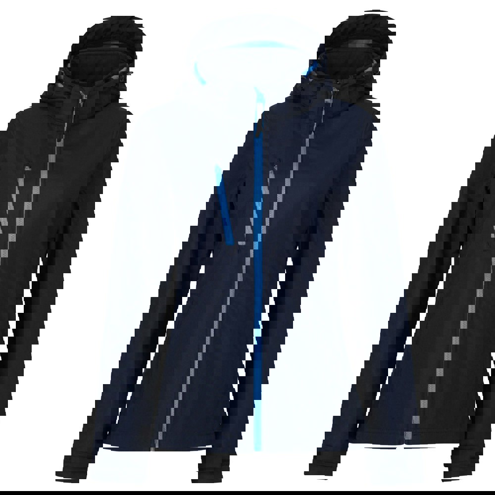 Regatta Venturer 3 Layer hooded soft shell jacket in navy/French blue. Made from 100% polyester with a 3-layer woven softshell construction and a plain finish. The 300gsm build is paired with Hydrafort 5000 and XPT technology, with breathable, lightweight, water repellent, waterproof and wind resistant properties. A full zip fastening keeps the front clean and practical for everyday outerwear.