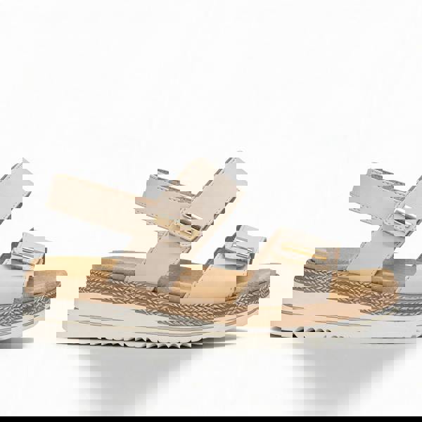 Ankle strap sandals with leather uppers, textile lining, and polyurethane soles. Features a round toe, touch fasten closure, lightweight design, and low wedge heel for comfort