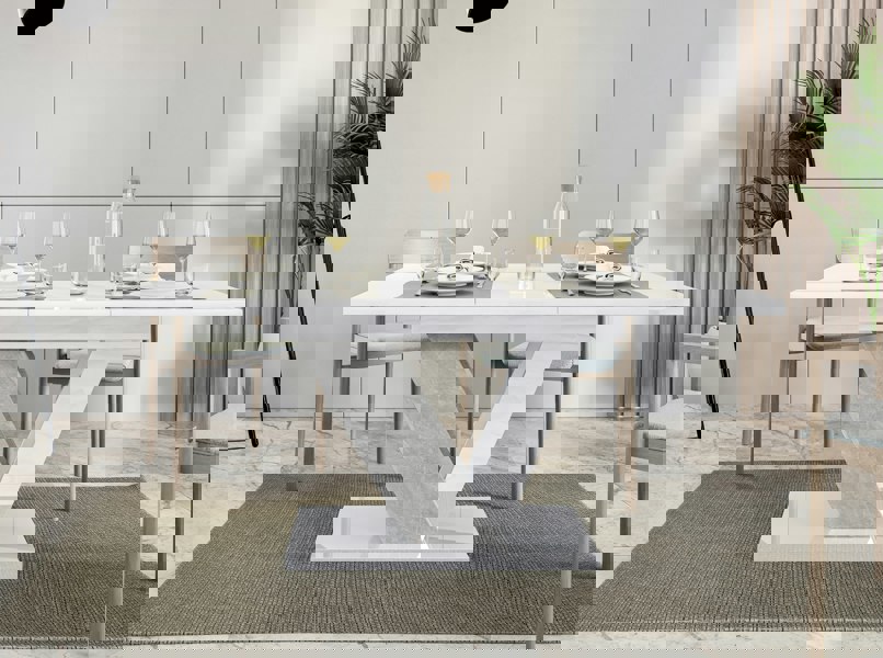 Modern elegance meets everyday functionality in the DUBAI extendable dining table. The sleek White Gloss top paired with a stylish Stone Effect V-shaped base creates a stunning contrast that blends contemporary minimalism with industrial charm.