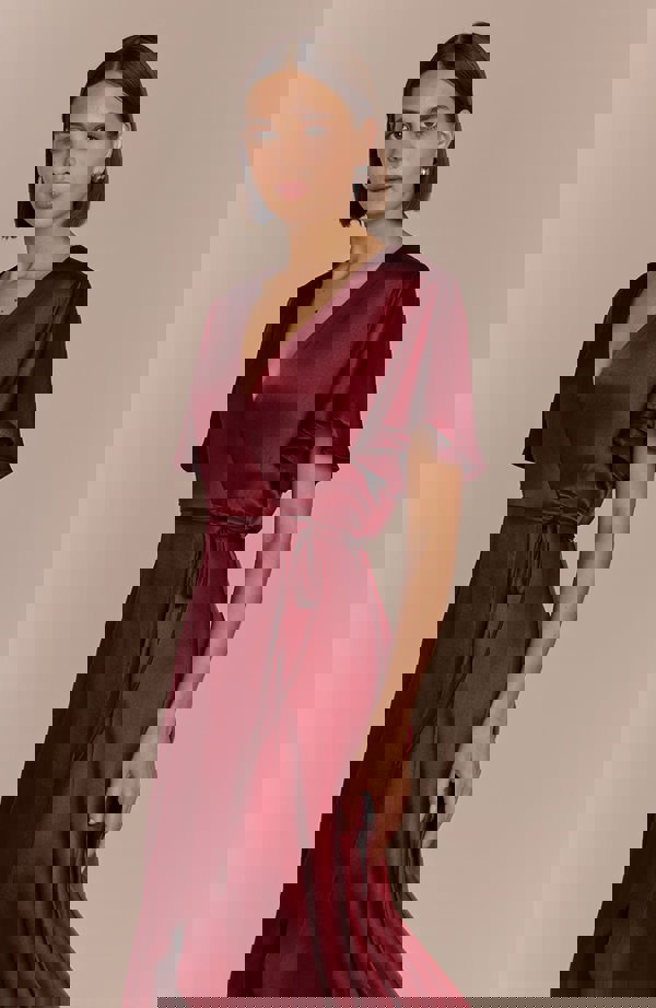 Say hello to our signature Florence Waterfall wrap dress in the most gorgeous shade of red wine burgundy. Crafted in beautiful flowing viscose satin, the Florence Waterfall dress is the ultimate wrap dress featuring waist ties, a back neck tie, short sleeves and a fluttering waterfall hem line. A-line for a flattering fit and perfect for any red wine spills.