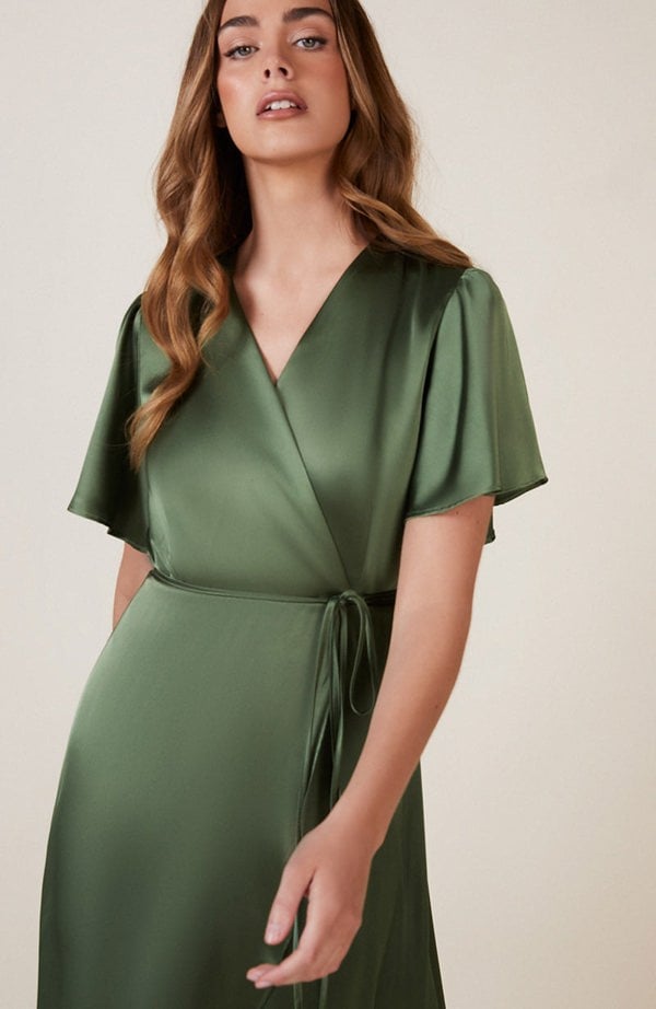 The Florence Waterfall hem wrap dress is crafted in the most beautiful satin. Midi length with draped short sleeves and a waterfall hem for a flattering fit no matter your body shape and size.
