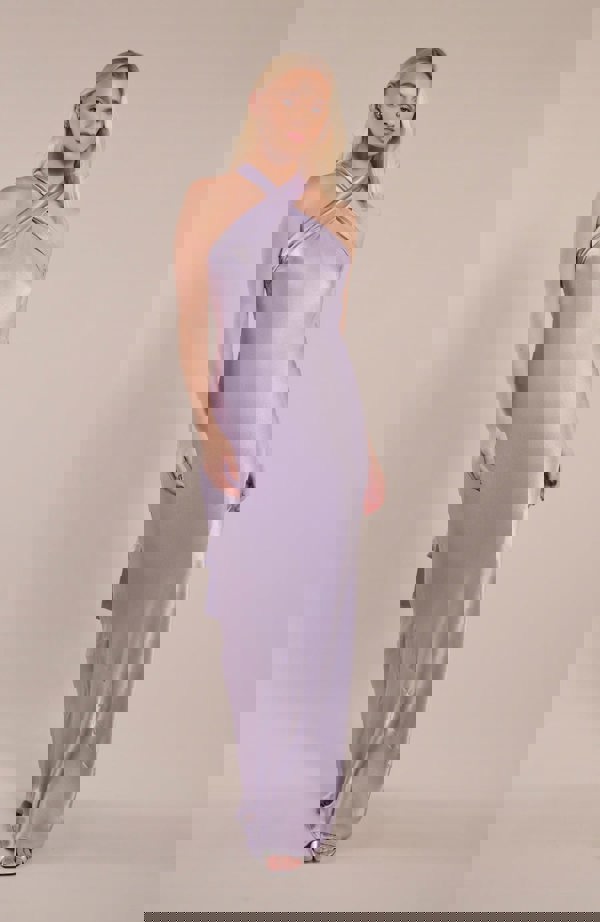 The Roma in pastel Lilac viscose satin is a show-stopping halterneck floor length dress with a long neck tie and cross over front. Crafted from the most beautiful drapey satin, this is one hell of a flattering satin bridesmaids dress in a gorgeous soft shade of lilac purple. Your bridesmaids will thank you for this one.