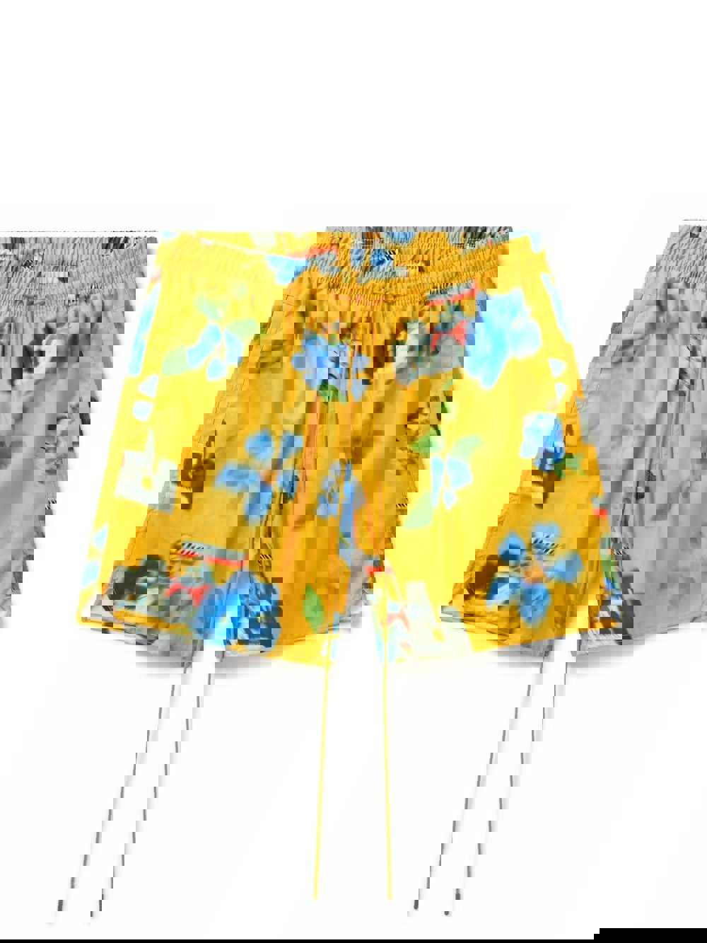 Nylon swim shorts from Rhude featuring a formula 1 car design with blurry floral features contrasting the yellow base colour
