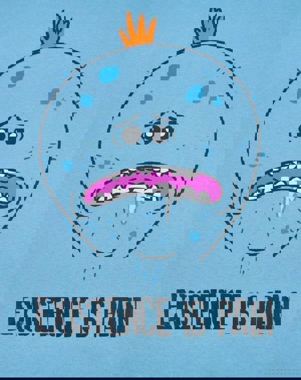Inspired by the hilarious season 1 episode "Meeseeks and Destroy," the design across the front of the tee sees the face of a distressed looking Mr Meeseeks, complete with the slogan "Existence is pain."